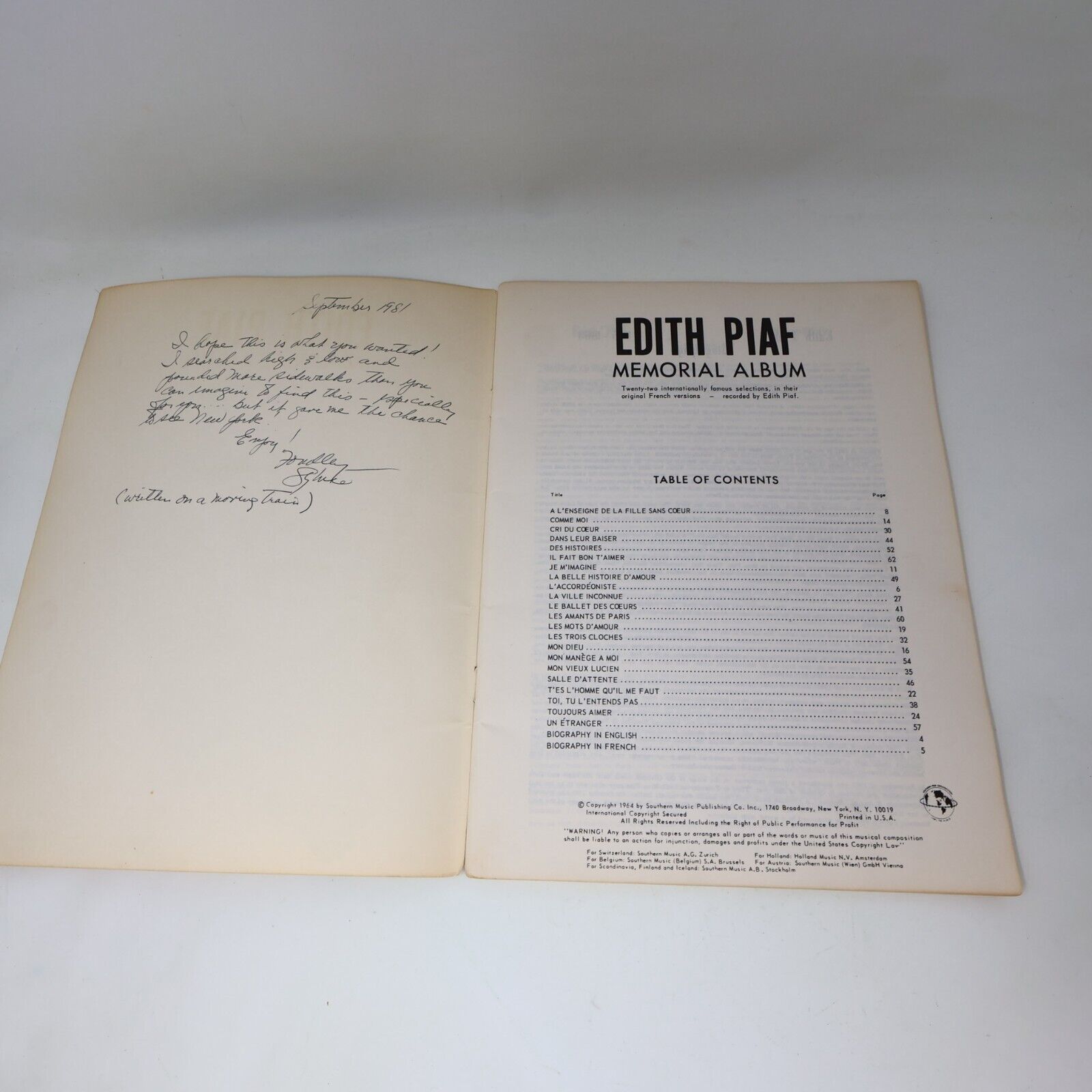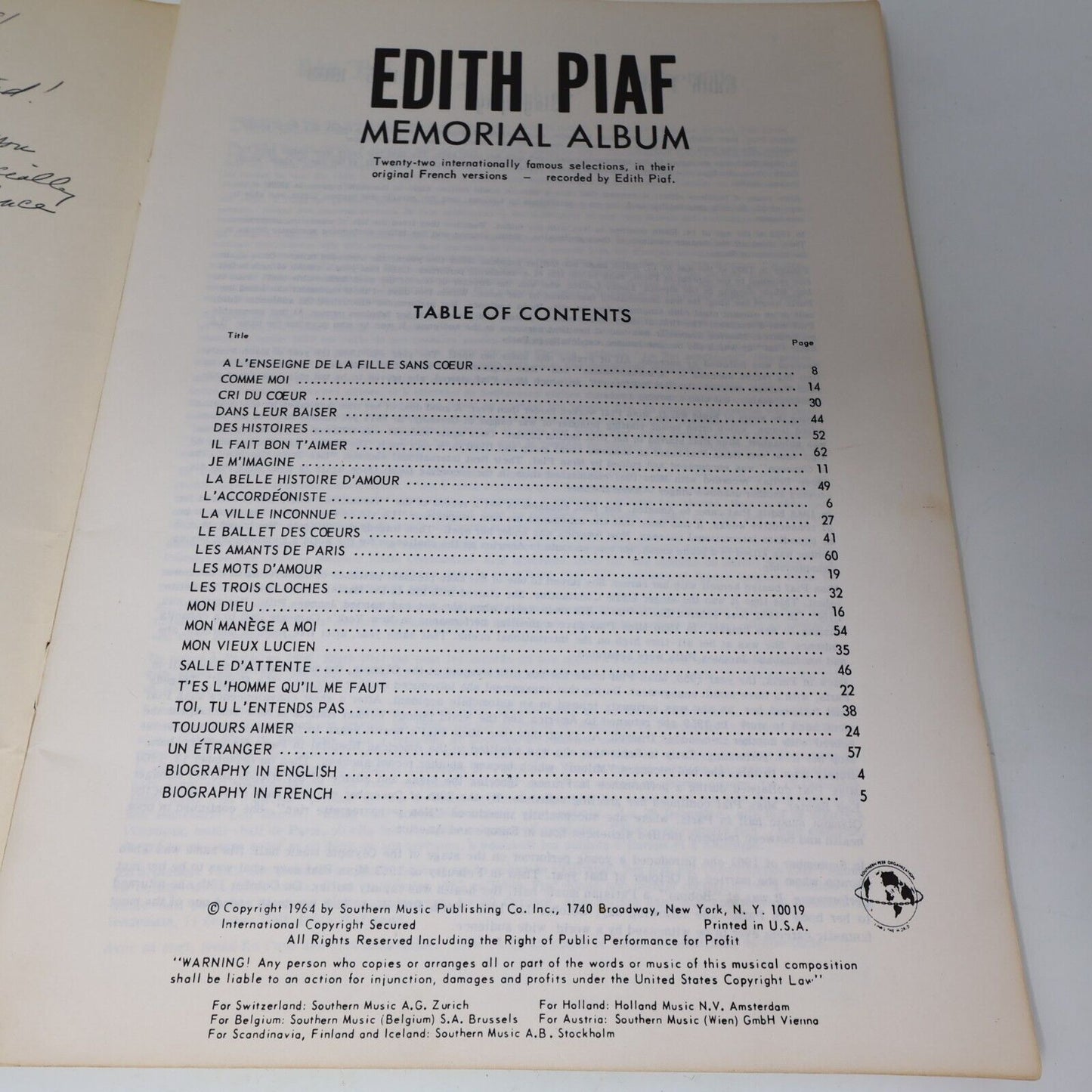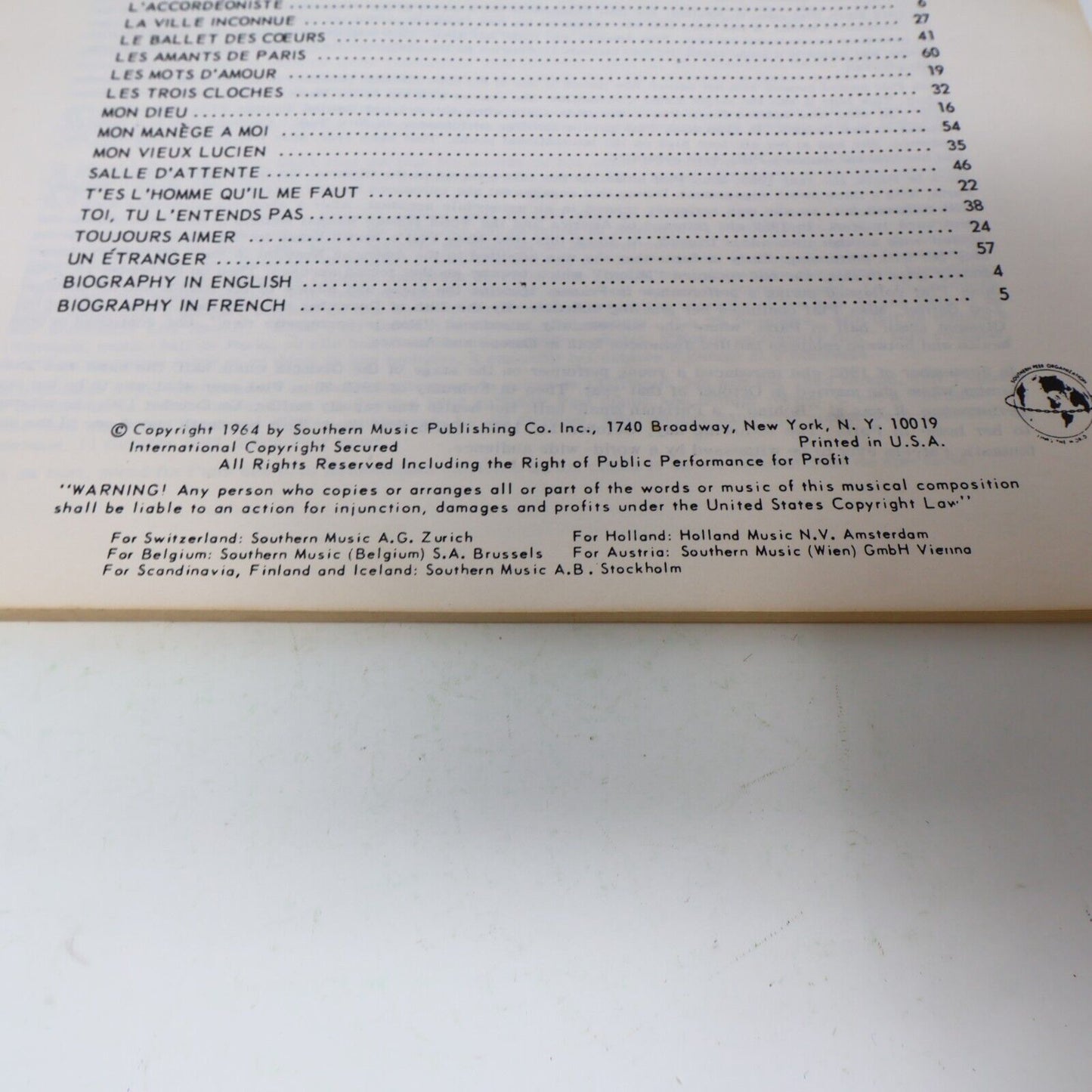 1964 Edith Piaf Album Commémoratif Peer Southern Paperback Songbook Partitions