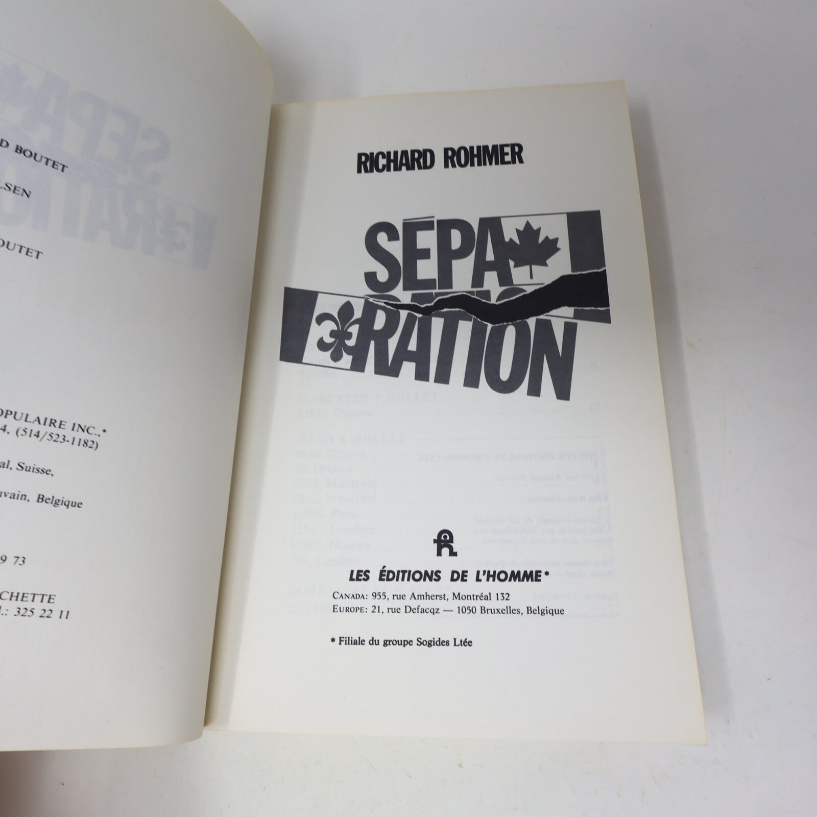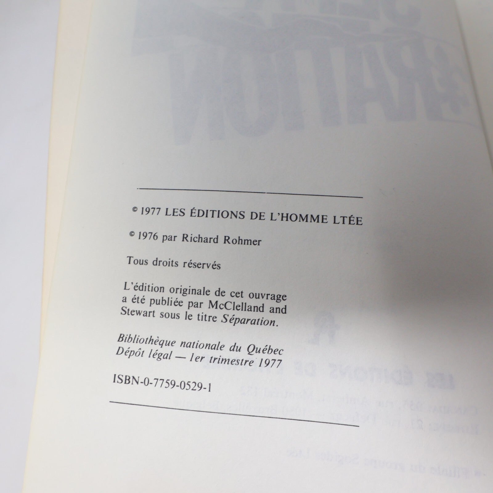 1977 Séparation Richard Rohmer De L'homme Québec Canada Fiction Historique Livre