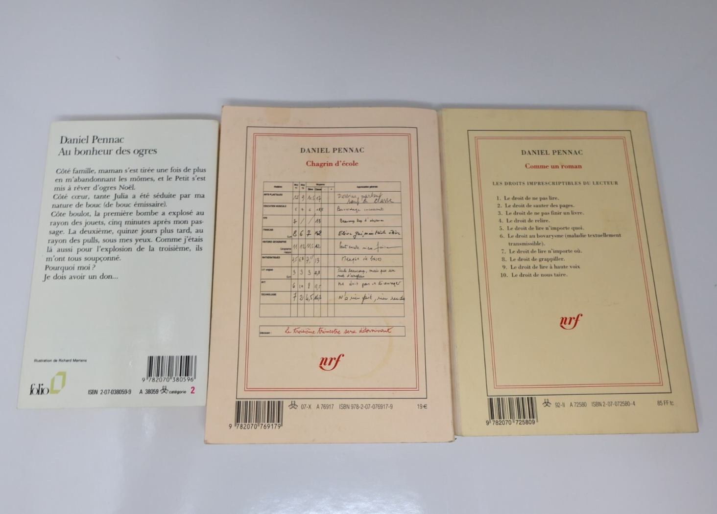Daniel Pennac Lot 3 Livres Comme un Roman/Chagrin d'École/Au Bonheur des Ogres