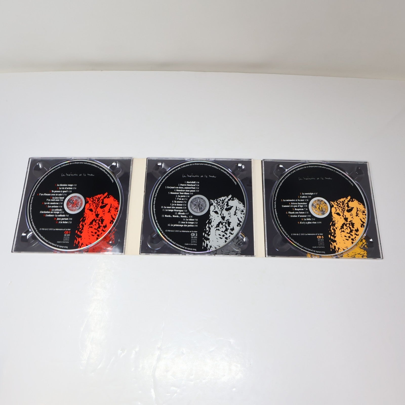 CDs de seconde main avec quelques signes d'usure. Un peu d'éraflures et d'usure sur les boîtiers. Provient de la collection personnelle de l'oncle de ma conjointe, il a été entreposé et utilisé avec soin. Les disques ont été inspectés visuellement. Testés pendant quelques minutes à des positions aléatoires avec succès. Rayures mineures sur les surfaces. Voir les photos pour avoir un aperçu de l'état.