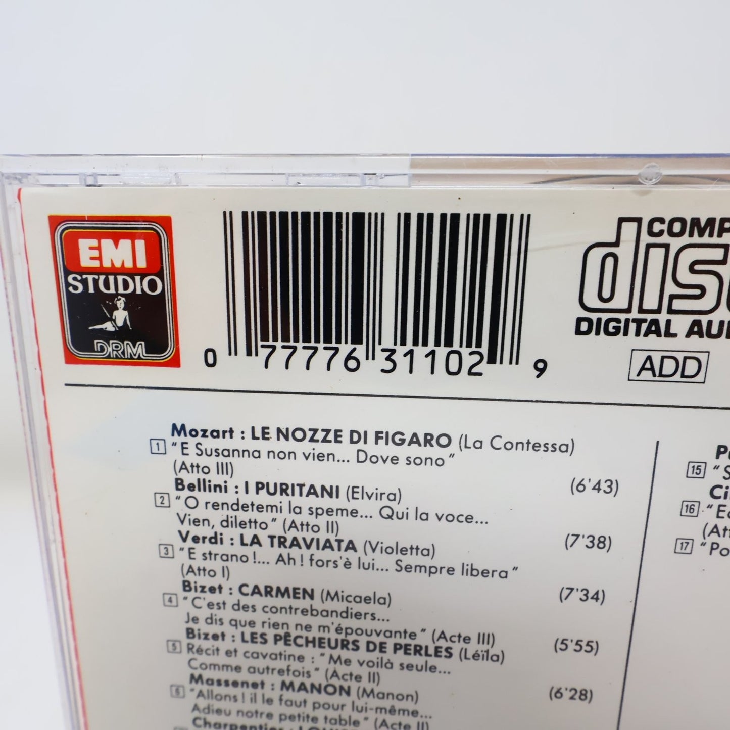 This CD features the exquisite soprano Mirella Freni performing a selection of iconic opera arias from some of the most beloved operas in the classical repertoire. The compilation includes highlights from Mozart's Le Nozze di Figaro, Bellini's I Puritani, Verdi's La Traviata, Bizet's Carmen and Les Pêcheurs de Perles, Massenet's Manon, Puccini's Gianni Schicchi, La Rondine, Tosca, Manon Lescaut, Turandot, Madama Butterfly, as well as Puccini's Suor Angelica and Cilea's Adriana Lecouvreur. Each aria showcases Freni's masterful vocal control and emotive interpretation, supported by renowned orchestras and conductors such as Franco Ferraris, Antonino Votto, and Leone Magiera.