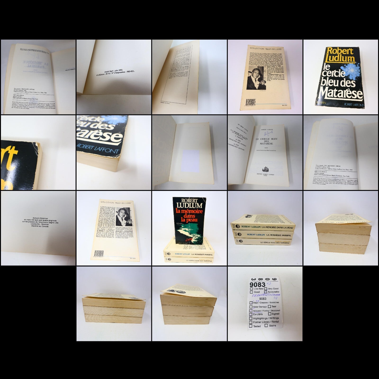Lot de livres d'occasion avec plusieurs signes d'usure visible sur les pages et les couvertures. Lot de 3 livres. Nom d'un ancien propriétaire écrit en première page. Imprimés en France (2) et au Canada (1). Plis sur les couvertures. Beaucoup d'usure visible sur les extrémités et sur les dos. Les pages sont jaunies. Vendus en lot seulement - les livres ne sont pas vendus séparément. Regardez les photos pour avoir un aperçu de la condition.